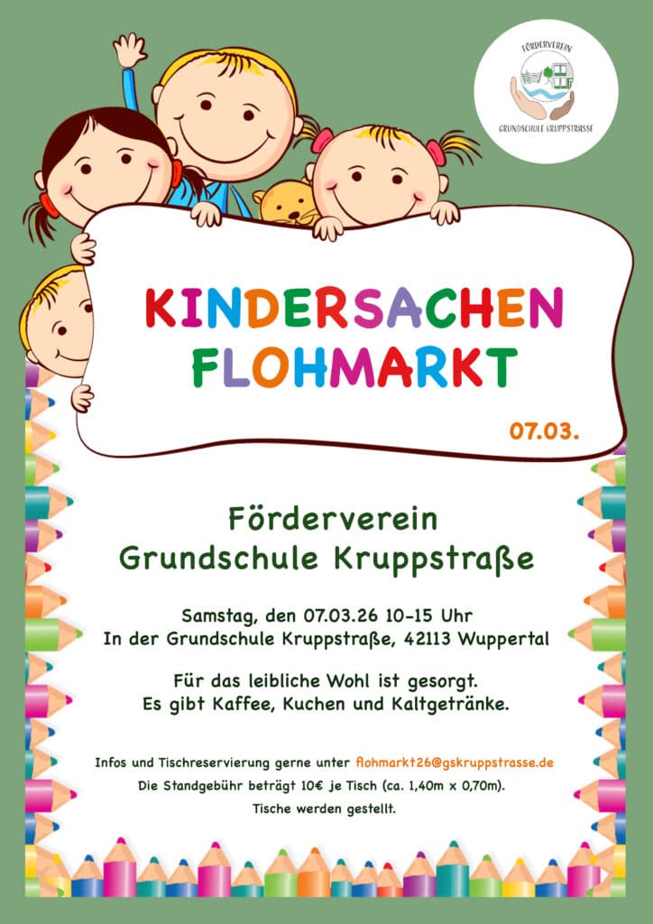 Der Förderverein der Grundschule Kruppstraße lädt ein zum Kindersachenflohmarkt 2026. Dieser findet am 07.03.26 in der Zeit von 10-15 Uhr statt. Ein Café sorgt mit Kaffee und Kuchen für das leibliche Wohl. Alle weiteren Informationen entnehmen sie dem Flyer im anhängenden Bild.